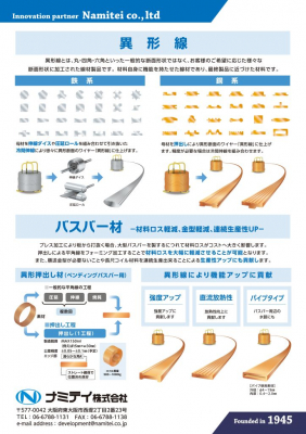 ・ナミテイのコア技術となる異形線。ニアネットにした線材をもとに部品を製造する事で、歩留り改善や工程省略などのメリットをご提示致します。部品によって様々なご活用方法がありますので是非ご来場ください。 【異形バスバー材】 強度アップ ・鉄に比べて強度に落ちる銅ですが、異形線にする事で強度アップをご提案します 直流放熱性 ・大電流を流すバスバーの課題として発熱があります。表面積を増やすことで放熱性をアップさせ課題を解決します パイプタイプ ・中空内にLLCなどのクーラントを流すことで更に熱対策にご活用いただければと思います |