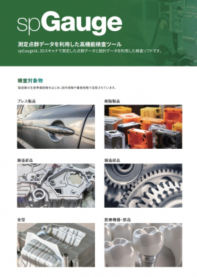 spGauge is inspection software that utilizes point cloud data captured by 3D scanners and design data. It is used in various stages of manufacturing, including production preparation, prototyping, and mass production. Significantly Reduces Prototype Development and Production Preparation Time By analyzing non-contact point cloud data and 3D CAD data, the software displays areas with deviations using a color map, allowing users to visually identify defects. Furthermore, it calculates dimensions from the non-contact point cloud data, making it easy to identify areas that do not meet tolerance specifications. By using non-contact measurement devices to quickly measure the surface geometry of products and molds, combined with the inspection software “spGauge,” you can significantly reduce prototyping and production preparation time, thereby cutting overall manufacturing man-hours. |