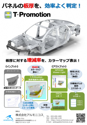 Developed in response to requests from the press industry to “efficiently determine the thickness of actually formed panels”! T-Promotion is a system that uses polygon data (non-contact measurement data) from both sides of a press panel to evaluate the rate of thickness deviation from the standard thickness dimension. It is effective for detecting thickness reduction and bottlenecks. |