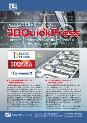 | PR message | Nanosoft proposed to Die & Mold Engineer by 3D Power!! 3DQuickPress is a world popular 3D Progressive Die Designing Software 3DQuick- Form and 3DSimSTAMP is Metal forming Simulation Software IMOLD is the Plastic Mold Designing Software. |