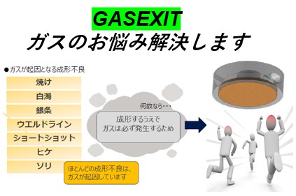 | PR message | Gas is the cause of most molding defects, but gas is inevitably generated during molding. GASEXIT is a molding solution component that can release gas from a variety of locations. GASEXIT solves problems that were difficult to solve with conventional gas venting methods and components. |