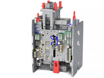 金型はPMMAの1射、ABSの2射、TPEの3射で構成され、主射出機、TOP側、非操作側から射出されます。金型はモーター駆動とガイドレールシステムを備え、二次成型回転を実現しています。 この構造により、標準的な射出成形機で2つの副射出ステーションを追加して使用でき、特別な3色射出成形機を必要とせず、コストと設備投資を削減します。 |