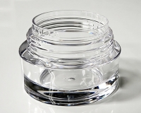 弊社オリジナル技術を使用したインジェクション金型機構により、高い透明度の厚肉底部やエッジの効いたスクエア形状を実現。出来上がったPET容器は、厚肉にもかかわらずガラスでは表現できないデザイン性も兼ね備えており、高級感を求められる化粧品容器に最適です。 |