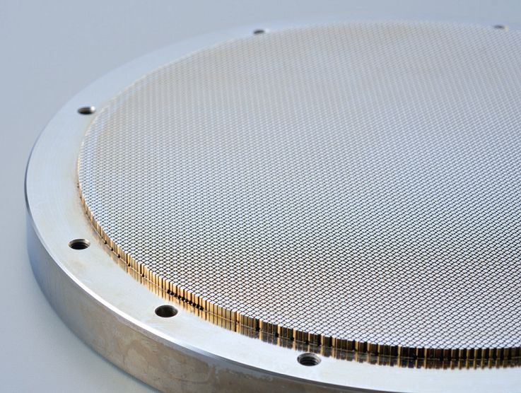 セラミックハニカム製造用の押出成形金型。 最小70,000cpsiの微細金型まで製作実績があります。 四角格子のほか、六角格子や異形格子などの特殊金型にも対応。 |