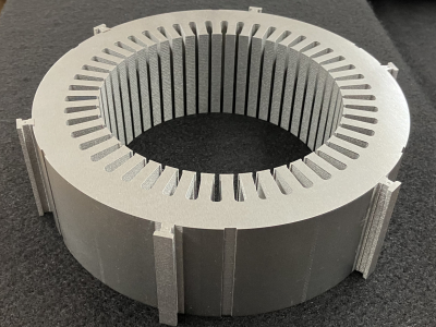 特徴は従来の分割ステーターコアと異なり、一体構造のステーターコアとして金型より排出した後、コアを分割できることです。 そのため、従来の分割コアでは出来なかった回転積層も可能となり、真円度・平行度・直角度・円筒度の精度が 従来の分割コアに比べて優れ、モーターとしてのコギングトルクが低減されます。 |