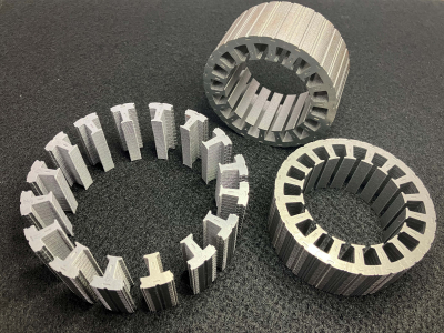 当社の金型では板厚0.1mm材(電磁鋼板)のモーターコアをカシメ積層で生産することが可能です。 そのため、薄板材の採用により「モーターの高性能化」、カシメ積層方式により「低コスト・高生産性」を実現します。 |