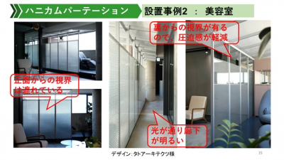 (1)正面から見られたくないという要望から45度で視界を調整し見えないようにした。 (2)狭いので圧迫感があるとのことから、裏から見えることで軽減をした。 (3)材質がアルミのため、外の光が反射することでパーテーションがあっても廊下が明るくなると言った省エネ効果もある。 |