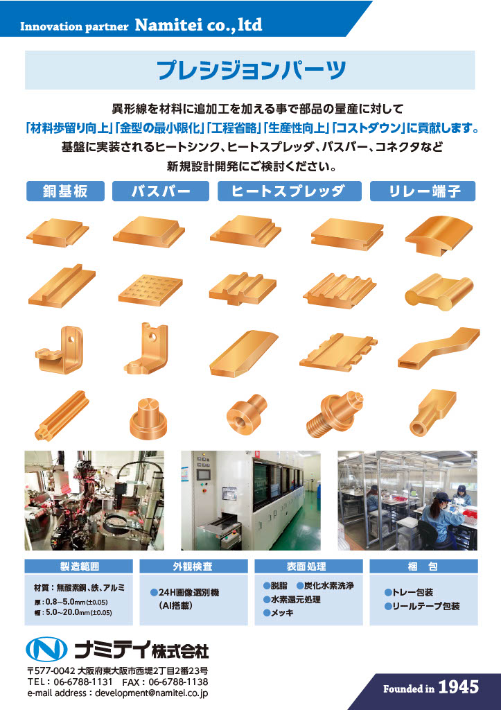 | PR文 | プリント基板に実装されるヒートシンクなど、銅部品のご提案です。 一般的には銅条からプレスで打抜くため材料ロスが発生しますが、弊社の「異形線」を材料として2次加工を加える事で大幅にスクラップを抑える事につながります。 金型や工程の省略など設計への折り込み方により、効果的を発揮します。 是非ご来場ください! |