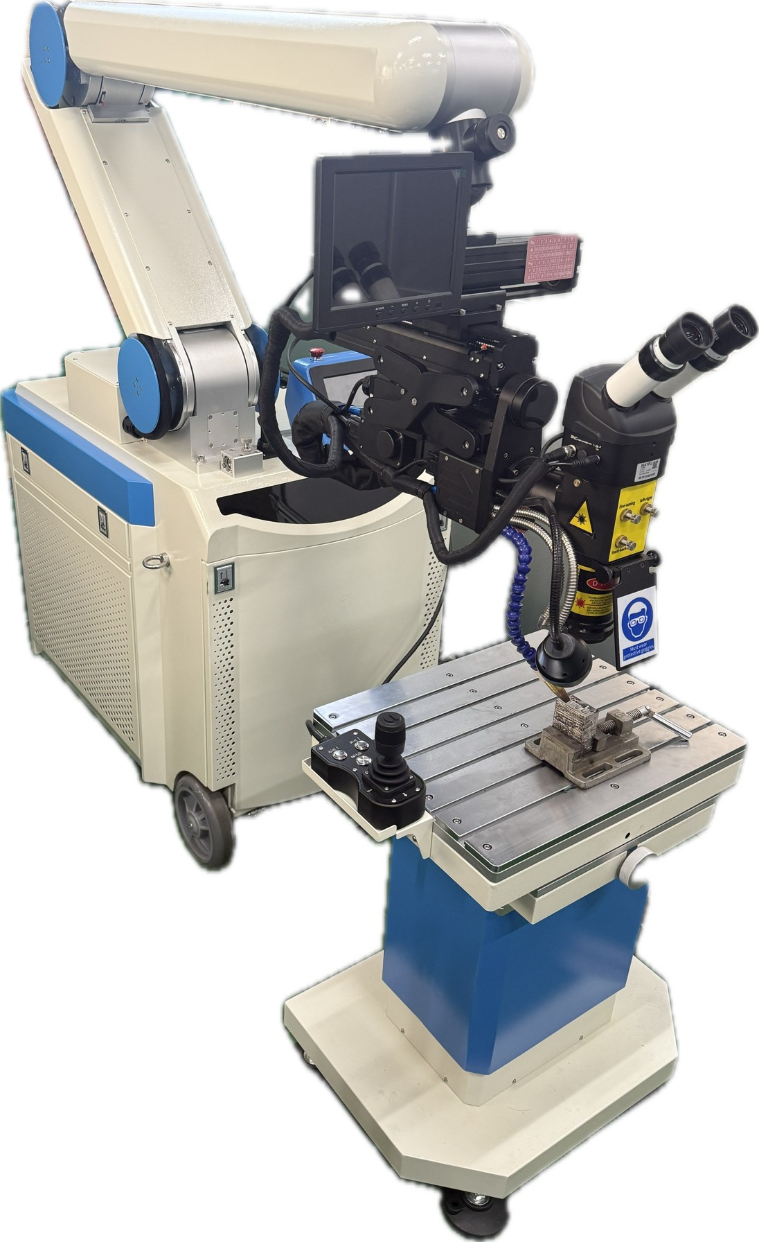 1. 製品概要 本製品は、サーボモーター駆動の関節式アームを搭載した最新のファイバーレーザ溶接機です。2026年のニューモデルとして、高い操作性と安定したビーム品質を両立しており、金型補修や精密部品の溶接に最適化されています。 2. 主な特徴とメリット 【高度な自由度と操作性】 ・サーボモーターで可動する関節式アームにより、あらゆる角度へ柔軟にスイング可能です。 ・レーザーヘッドは180度回転でき、ワークの側面の溶接も容易に行えます。 ・3軸ジョイスティックにより、アームの移動(前後・左右・上下)やレーザー照射の操作を自在に行えます。 【優れた加工品質と安定性】 ・ガルバノミラー搭載により、高品質で安定したビームを提供します。 ・専用チラーを内蔵し、長時間の連続溶接でも高い安定性を維持します。 ・アルゴンガス保護システムを搭載し、酸化を防いで溶接品質を保証します。 【効率性とメンテナンス性】 ・従来のYAGレーザと比較し、消費電力を大幅に削減しています。 ・ファイバーレーザ方式のため、消耗品であるフラッシュランプの交換が不要です。 3. 主要構成 ・一体型キャビネット: レーザー光源、冷却装置(チラー)、制御システムをコンパクトに集約。 ・電動昇降テーブル: 精密ボールねじと高精度リニアガイドレールを採用し、正確な位置決めが可能です。 ・クイックパラメータ画面: 自在にパラメータを調整できる回転式の画面を備えています。 |