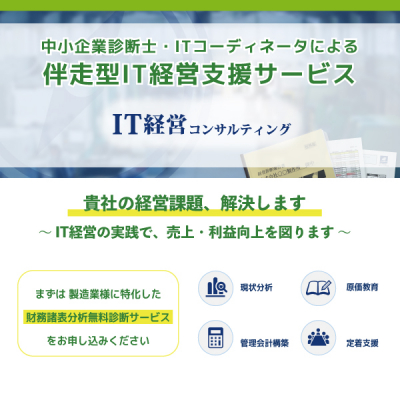 IT戦略パートナーとして、貴社の経営課題を解決、売上・利益向上を図ります。 ◇製造業に特化した財務諸表分析の無料診断サービスを実施 ◇目標営業利益達成に向けた伴走型の支援 ◇経営数字の見える化で原価会議を実現 ◇IT運用による工数集計で原価検証 ▼製品詳細はこちら https://www.techs-s.com/product/it-keiei |